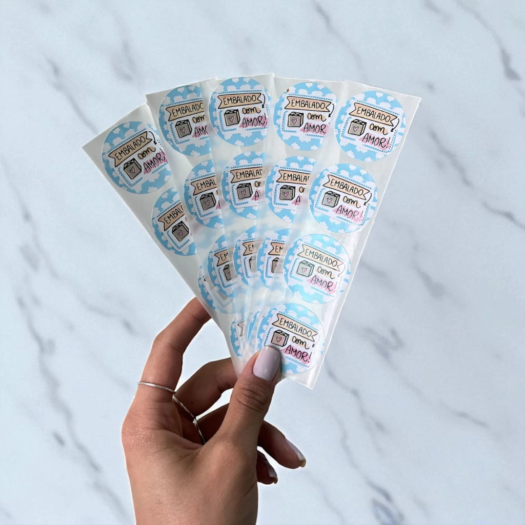 Pacote com 20 etiquetas adesivas enviadas em cartelas, ideais para personalizar embalagens e encantar seus clientes. Produzidas com papel couché adesivo de alta qualidade e cola forte, garantem fixação firme e duradoura. O acabamento com Verniz UV proporciona brilho especial e proteção contra desgaste, mantendo as cores vivas por mais tempo.