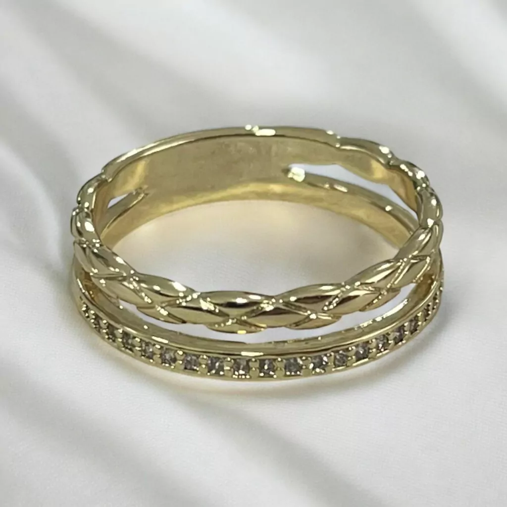 O produto conta com um anel nduplo com uma faixa trançada e uma faixa de zircônias.
