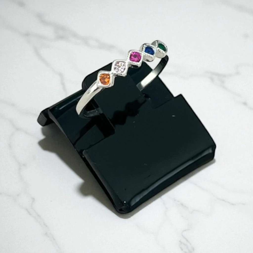 O produto conta com anel molelo meia aliança, com zircônia em formato de losângo colorida