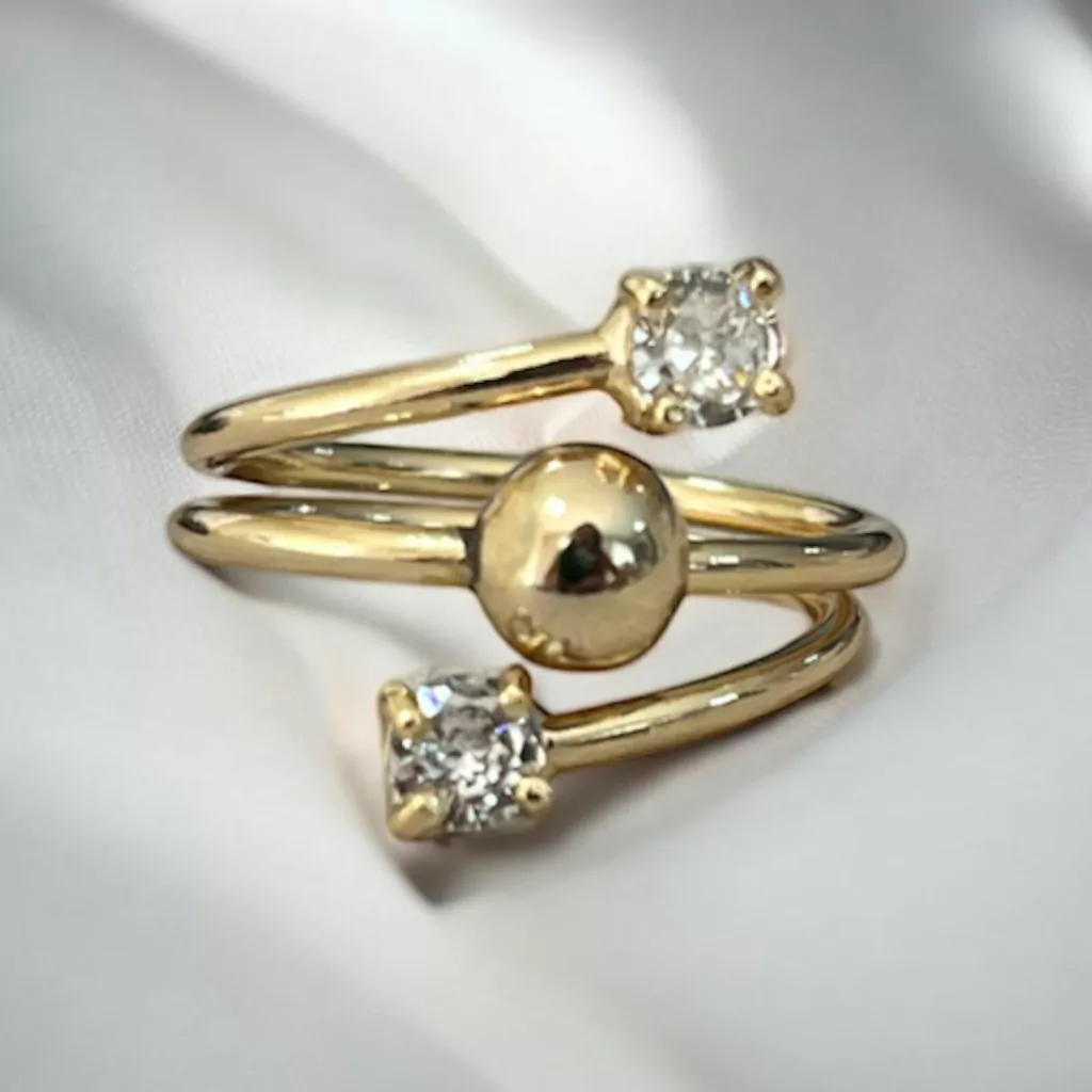 O produto conta com um anel com três fios com zircônias na extremidade e uma bola no meio,