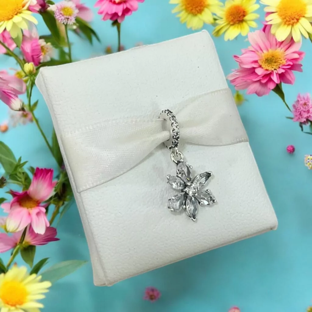 O produto conta com um berloque em formato de flor cravejado com zircônias.