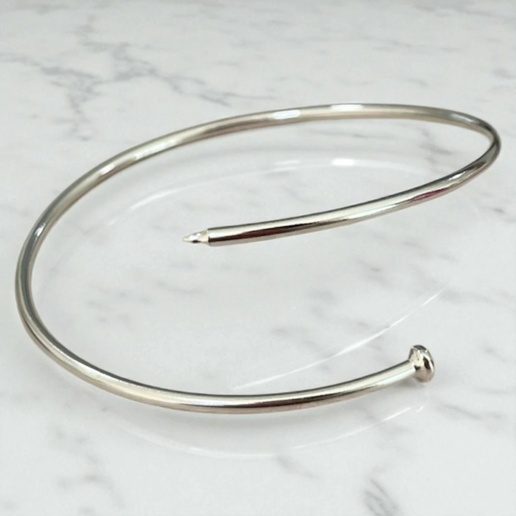 O produto conta com um bracelete fio redondo com as extremidades em formato de prego.