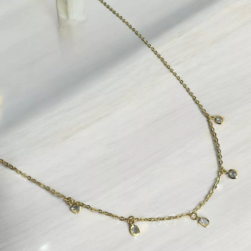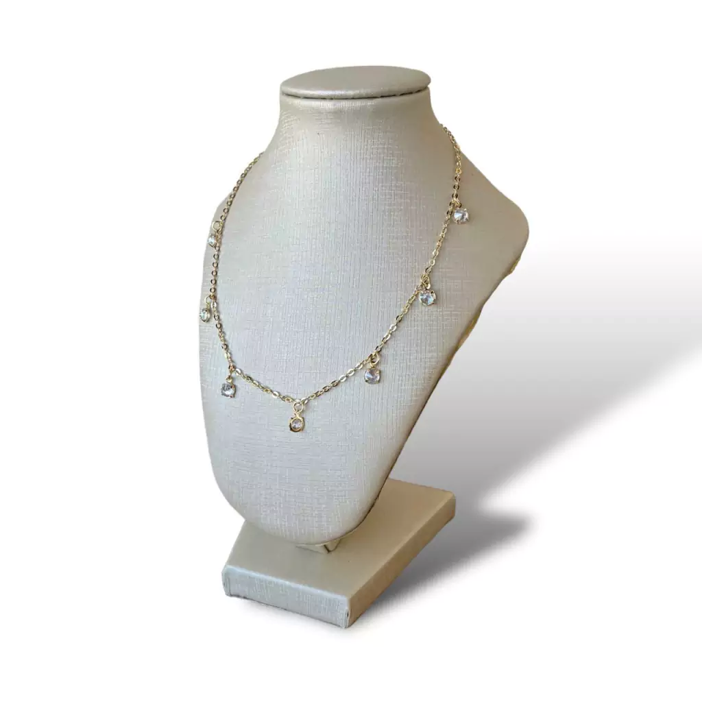 O produto conta com uma cartier de 60cm (+5cm de extensor) e 7 pingentes redondos de zircônia 5mm.