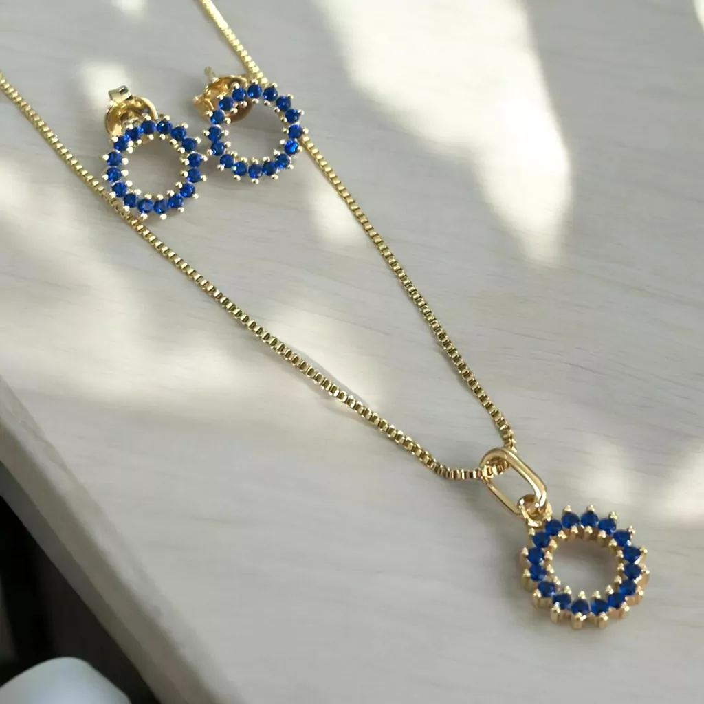 O produto conta com um par de brincos e um pingente com aro cravejado azul, com uma veneziana de 45cm + 5cm de extensor.