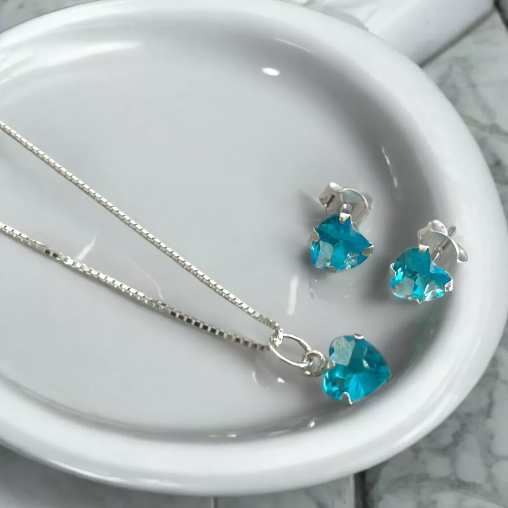 O produto conta com um conjunto ( brinco e pingente) coração de zircônia 6mm.
