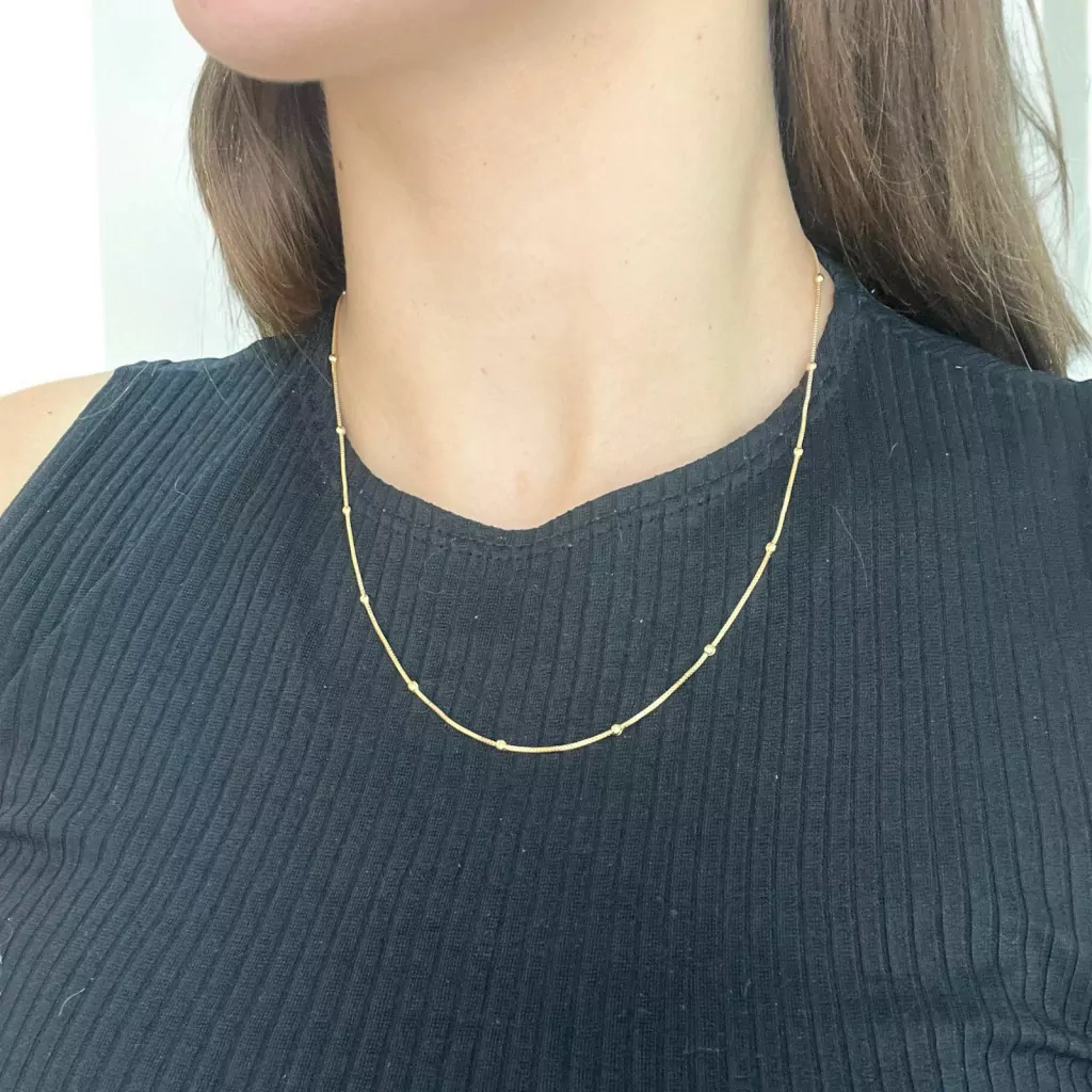 O produto conta com uma corrente veneziana com bolinha 2mm, com 50cm + 5cm de extensor.