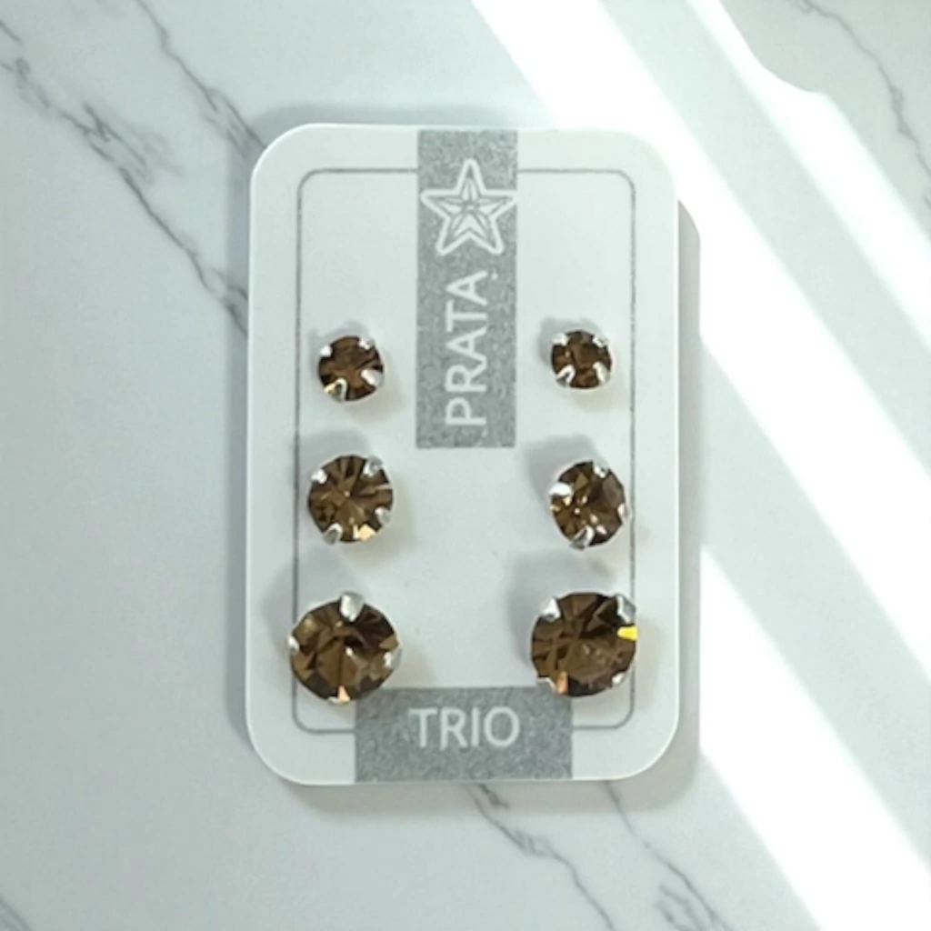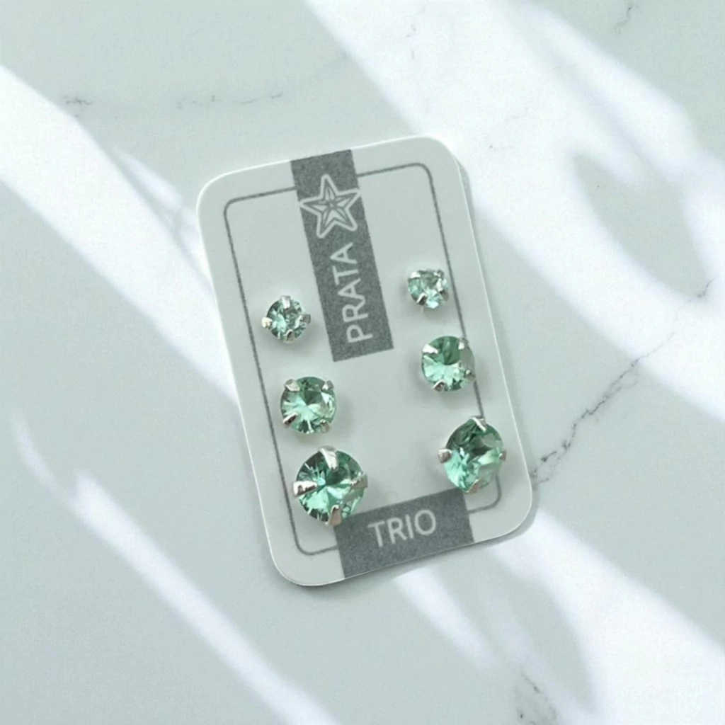 O produto consta com trio de brincos de zircônia redondo de diversas cores